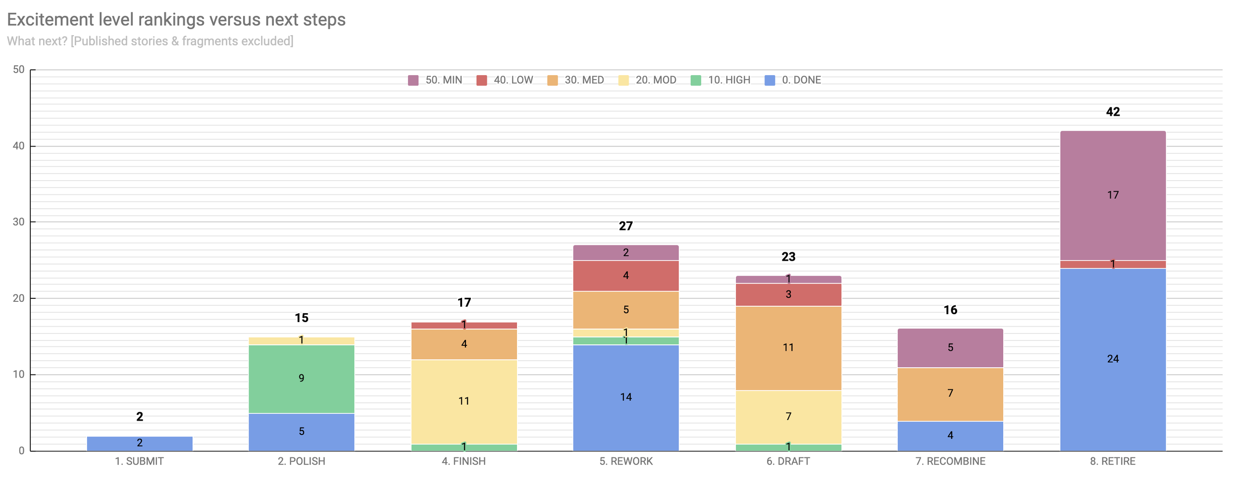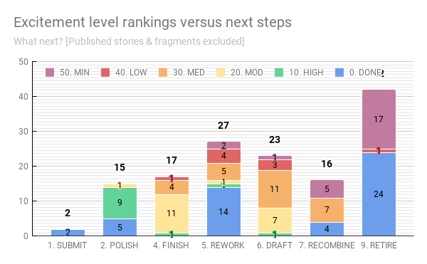 I’m also curious about the nine HIGH-ranked stories in the polishing stage—there’s a chance they could be moved to REWORK, RETIRE, or RECOMBINE once done. There is no guarantee that anything I write ever makes it to the submittable stage.