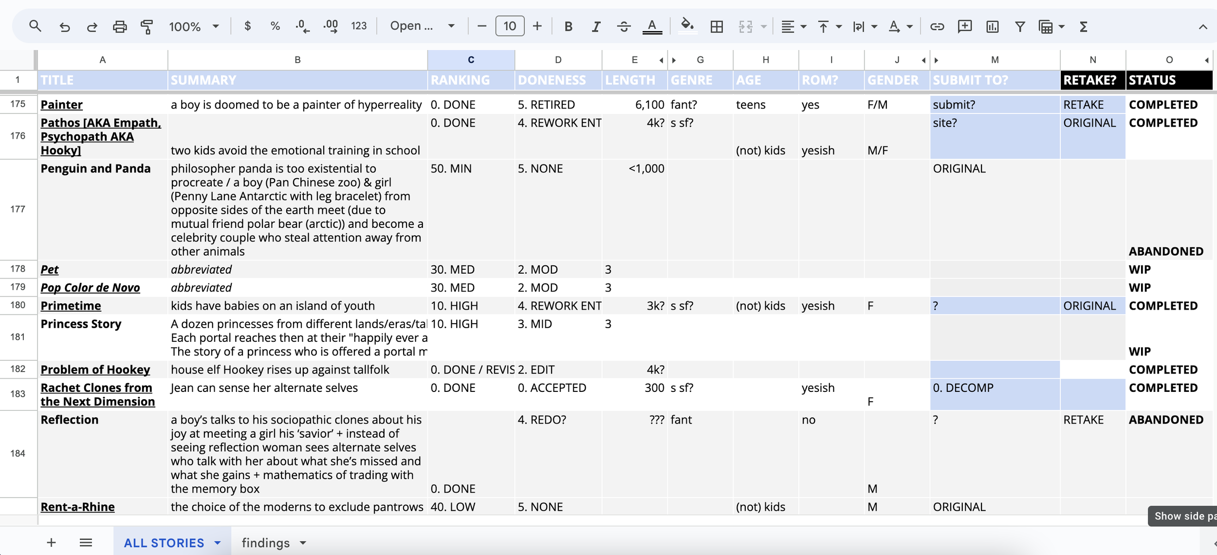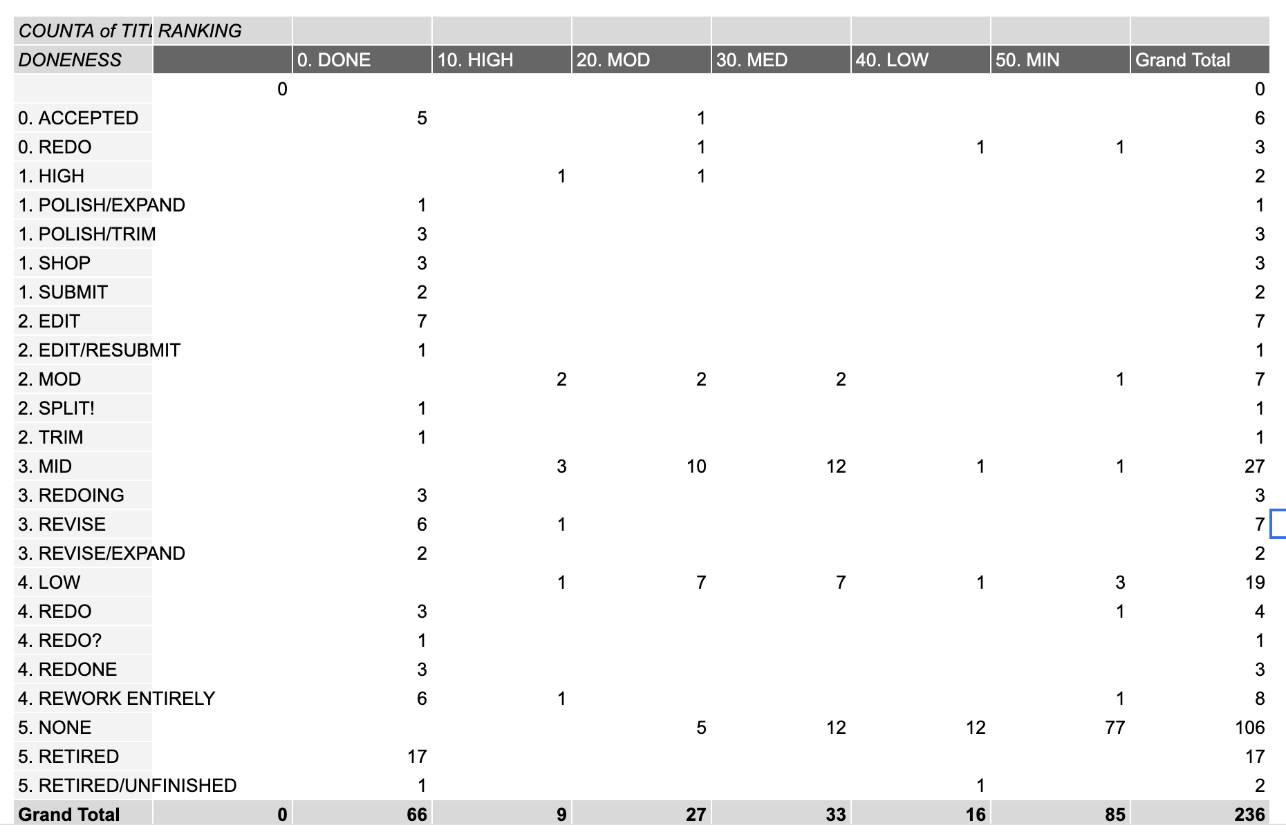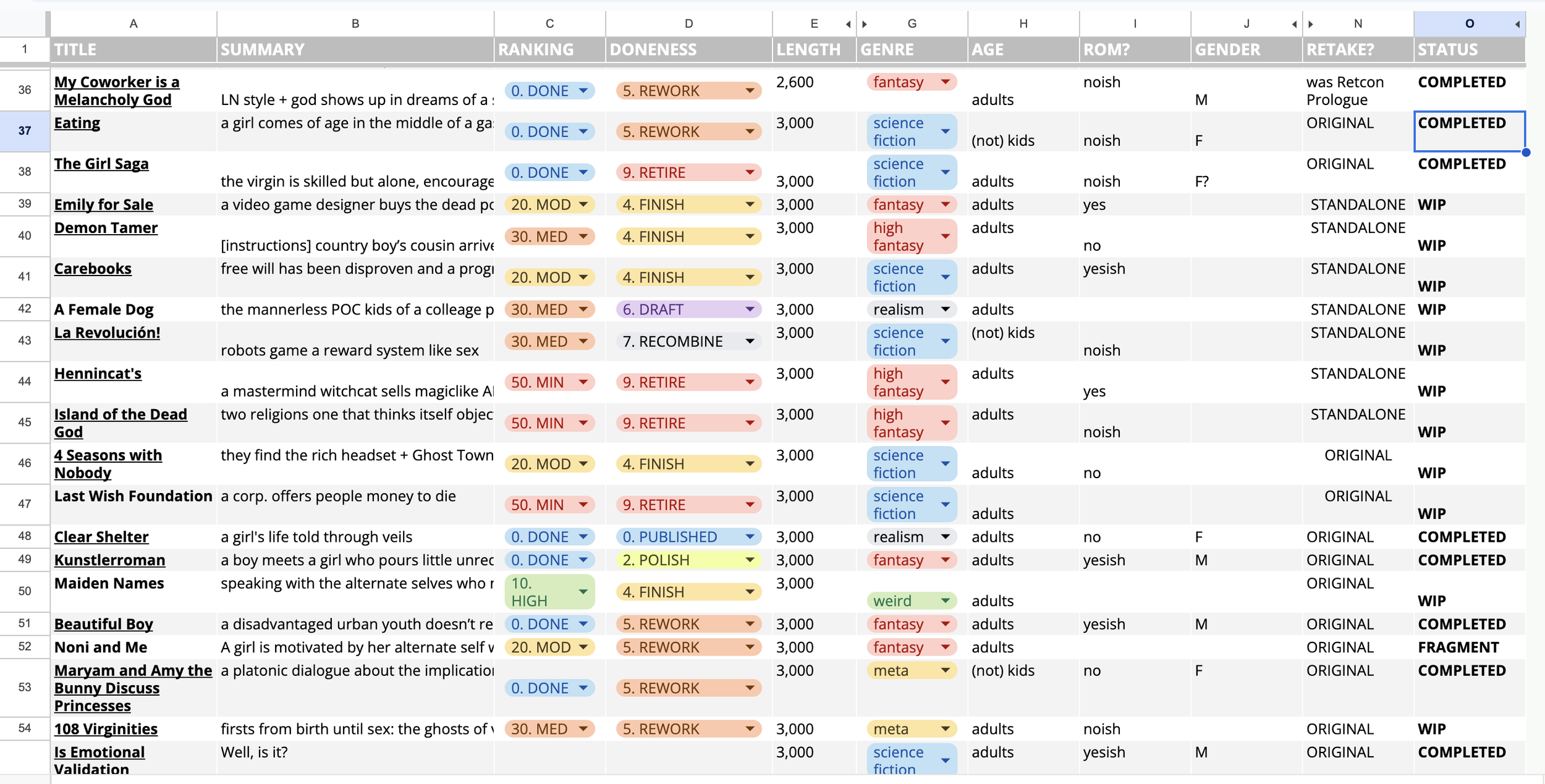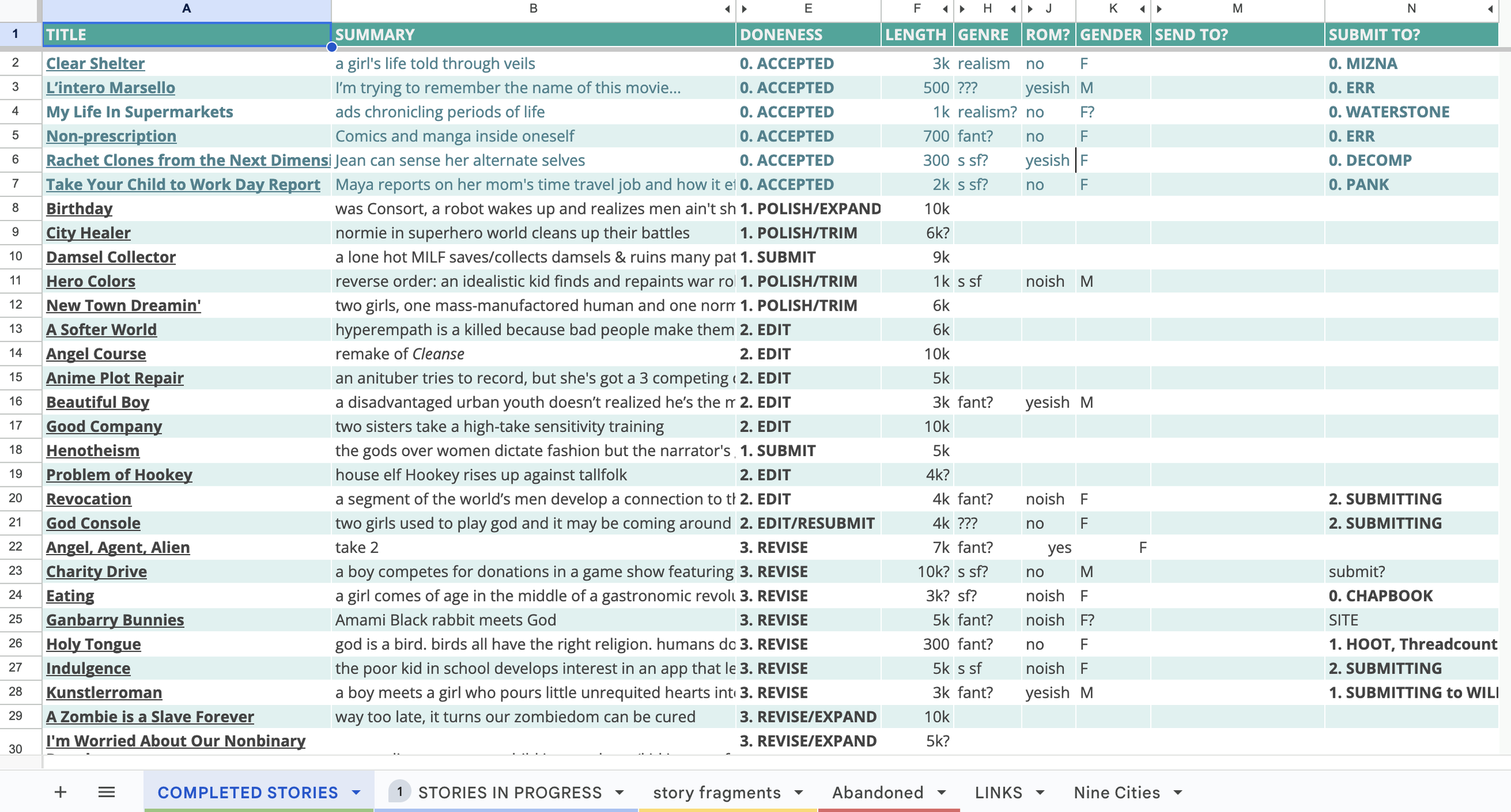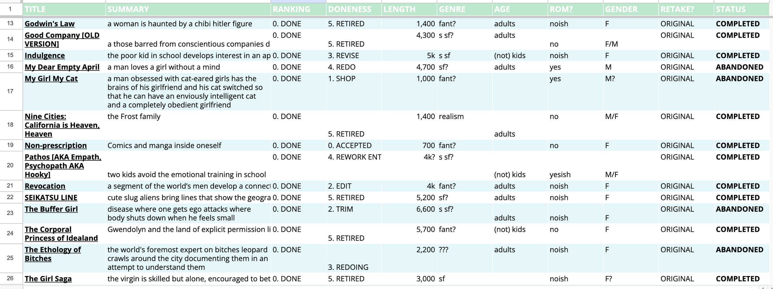 It looks like I’ve been using the DONENESS category to leave notes on next steps to myself: some of these stories I want to rework entirely, some I want to trim, some I want to expand, some I want to workshop, and just two are ready to submit.