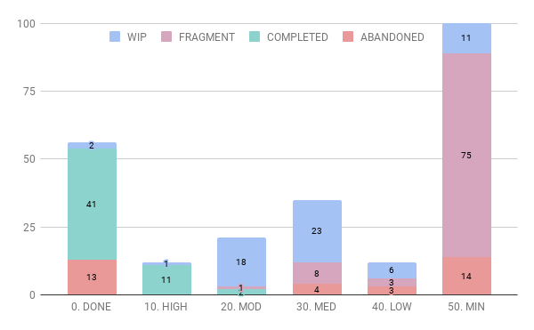 When we remove FRAGMENTs and PUBLISHED stories, it still turns out that half of what I abandon is complete stories—less than half are scraps. It might be interesting to look into the age of those abandoned stories, as they might just be silly juvenilia. Or, it might be interesting to compare it to the data on REWORKs and RETAKEs I’d begun to capture—how many of these abandoned were transformed into something else?