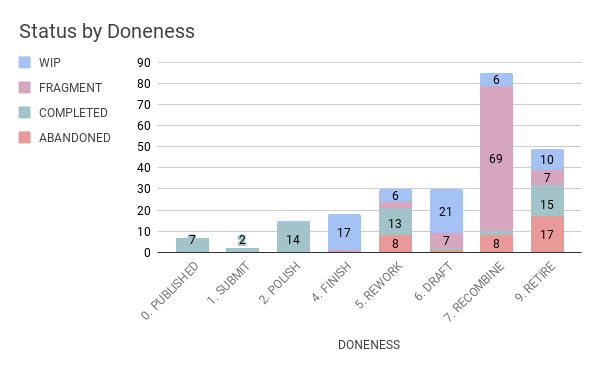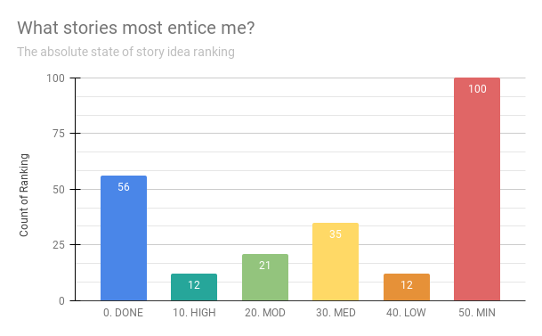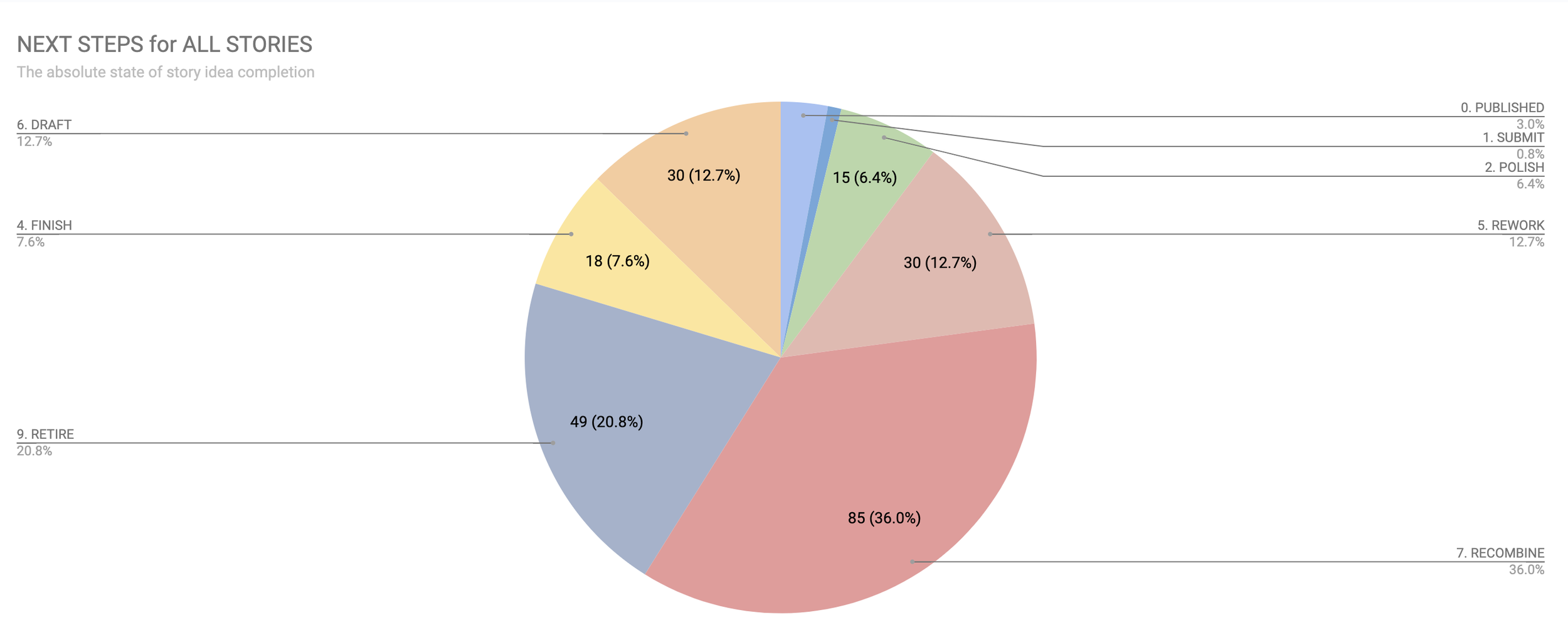 We could dig deeper into this data by removing the DONE/PUBLISHED stories and the fragments and retired projects. But even just eyeballing it, it looks like I have a rough three-way split between stories that need revising, stories that need to be drafted, and stories that need finishing and polishing.
